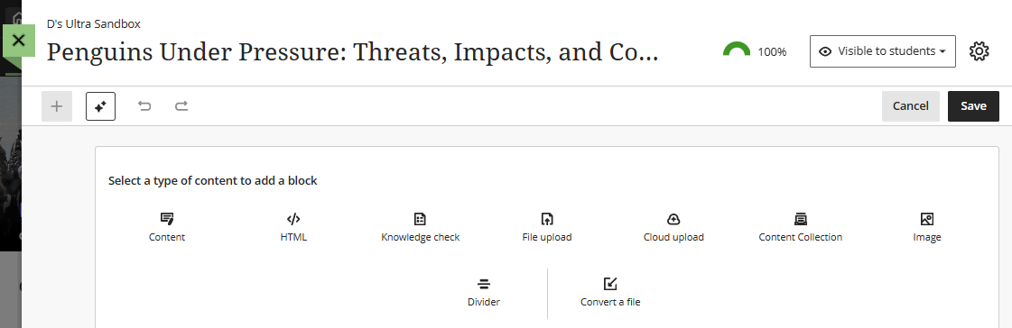 An Ultra Document lets you present a variety of content—text, images, video, attachments, links, Knowledge Checks, and more—all in one place. You can use it to build rich course materials by combining multiple visual and textual elements into a single, streamlined item. Ultra Documents are built with flexible block types, giving you control over layout, design, and how your content is displayed.