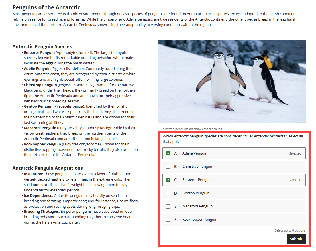 The Knowledge Check block allows you to create multiple choice and multiple answer questions for students to engage with and receive immediate feedback.