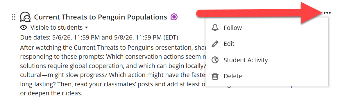 - Edit: Select Edit to edit your discussion prompt or modify your discussion settings.