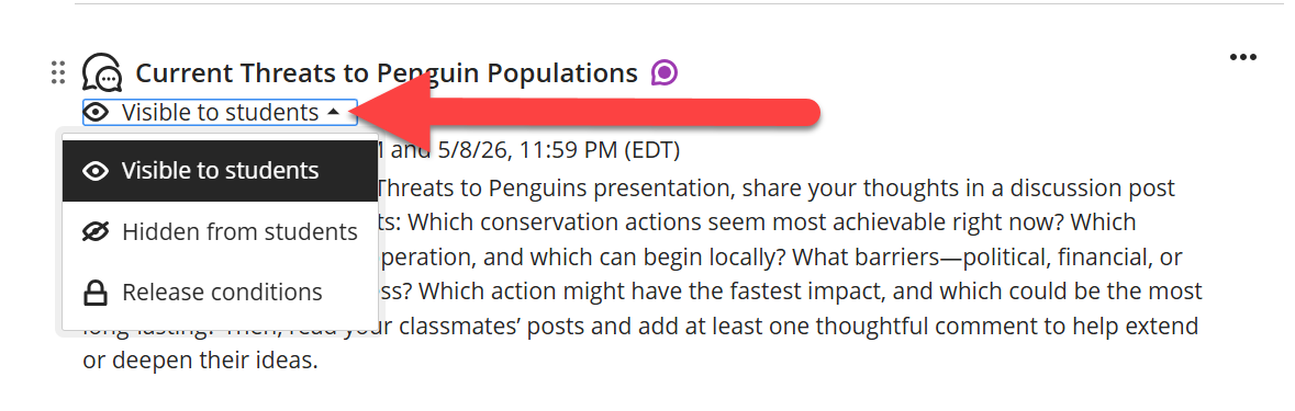 You may also change the visibility of your discussion to make it visible or hidden to students or to set release dates.