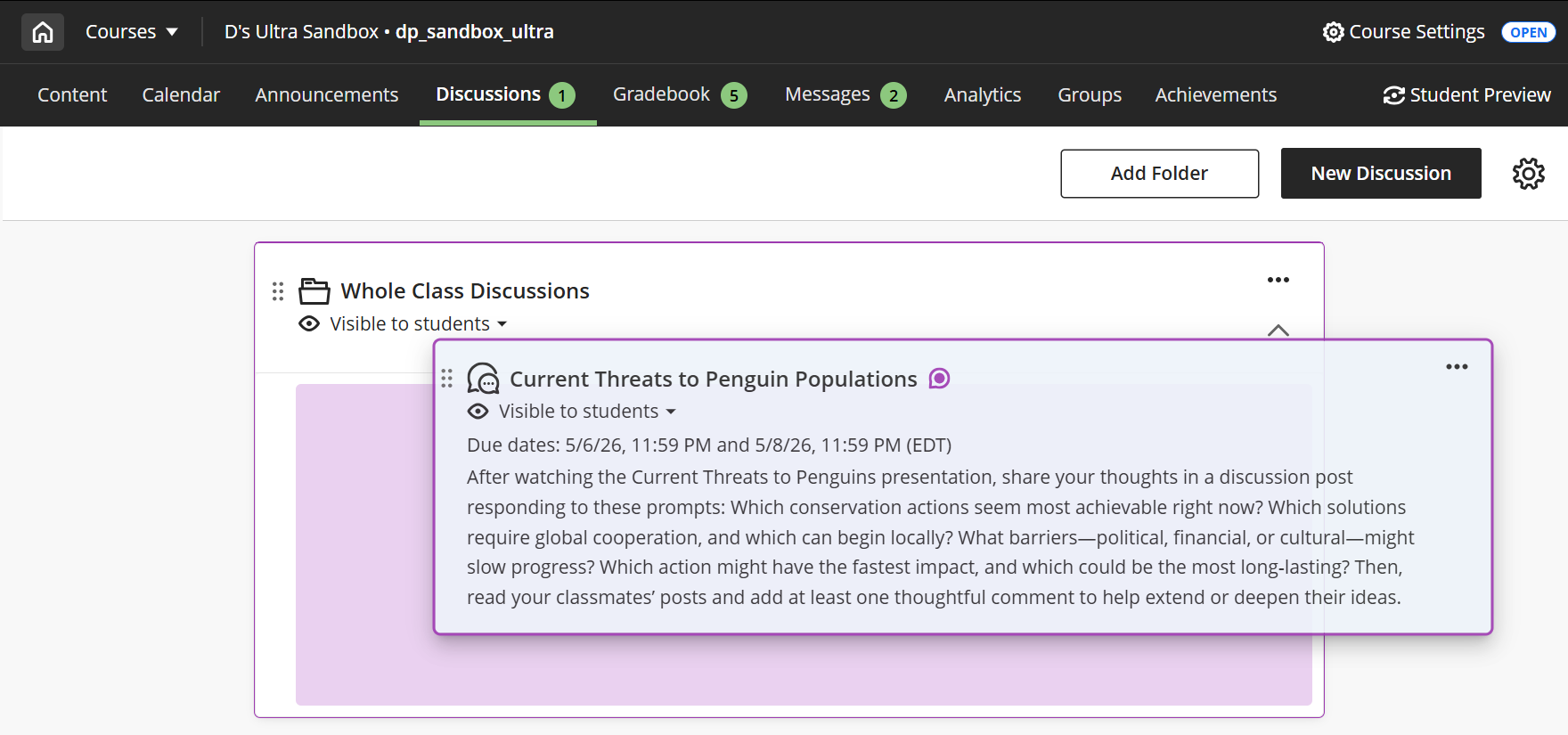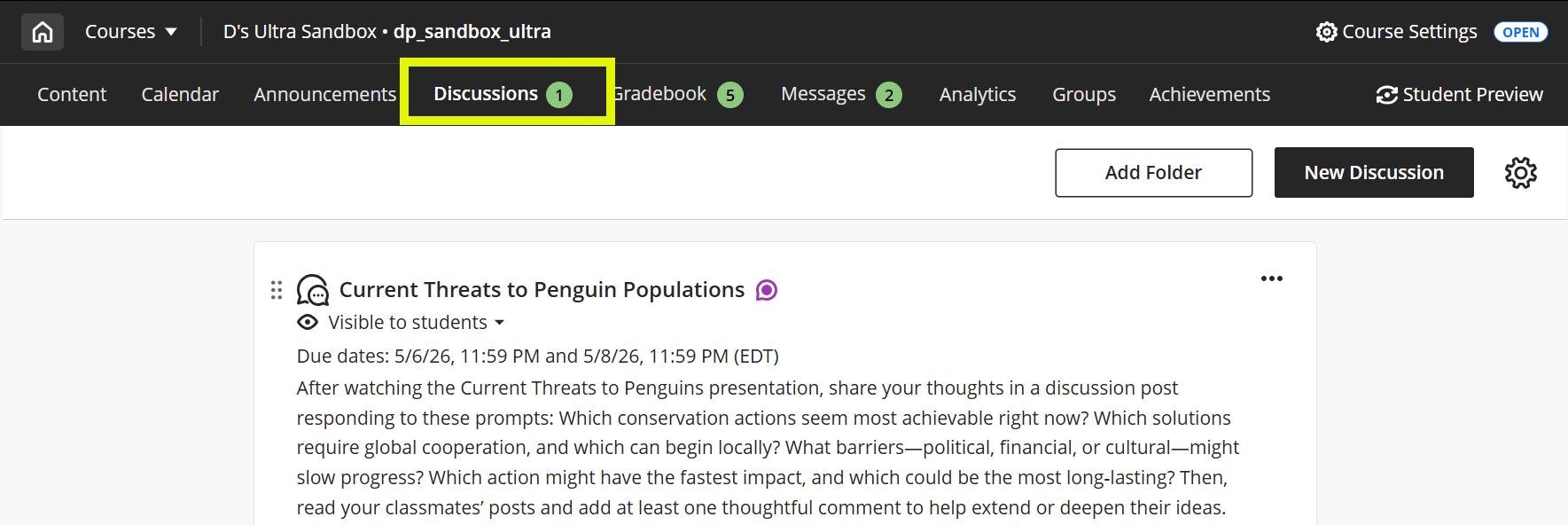 Blackboard Ultra features robust Discussions that support student engagement and critical thinking. You can create discussions for specific lessons, the course as a whole, and/or create group discussions. You also have the option to grade your discussions and specify due dates and participation requirements.