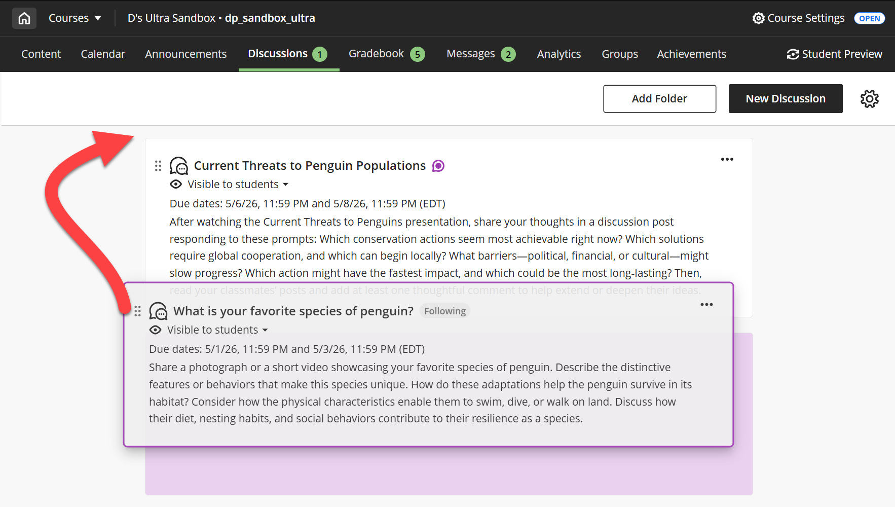 Your discussions will appear on the page in the order in which they were created. You can reorder your discussions by clicking on the Move button (six dots) and dragging your discussion to the desired location on the page.