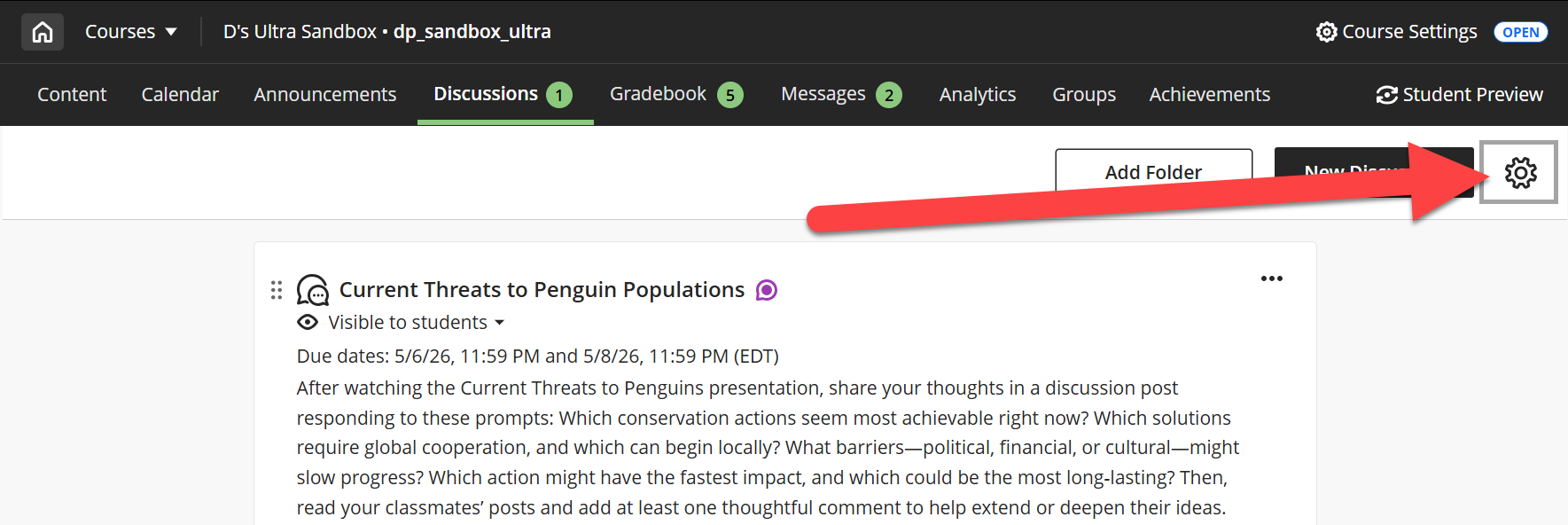 Click on the Discussion Settings (gear icon) to add grading and participation information, prevent students from editing published posts, allow anonymous responses, and more.