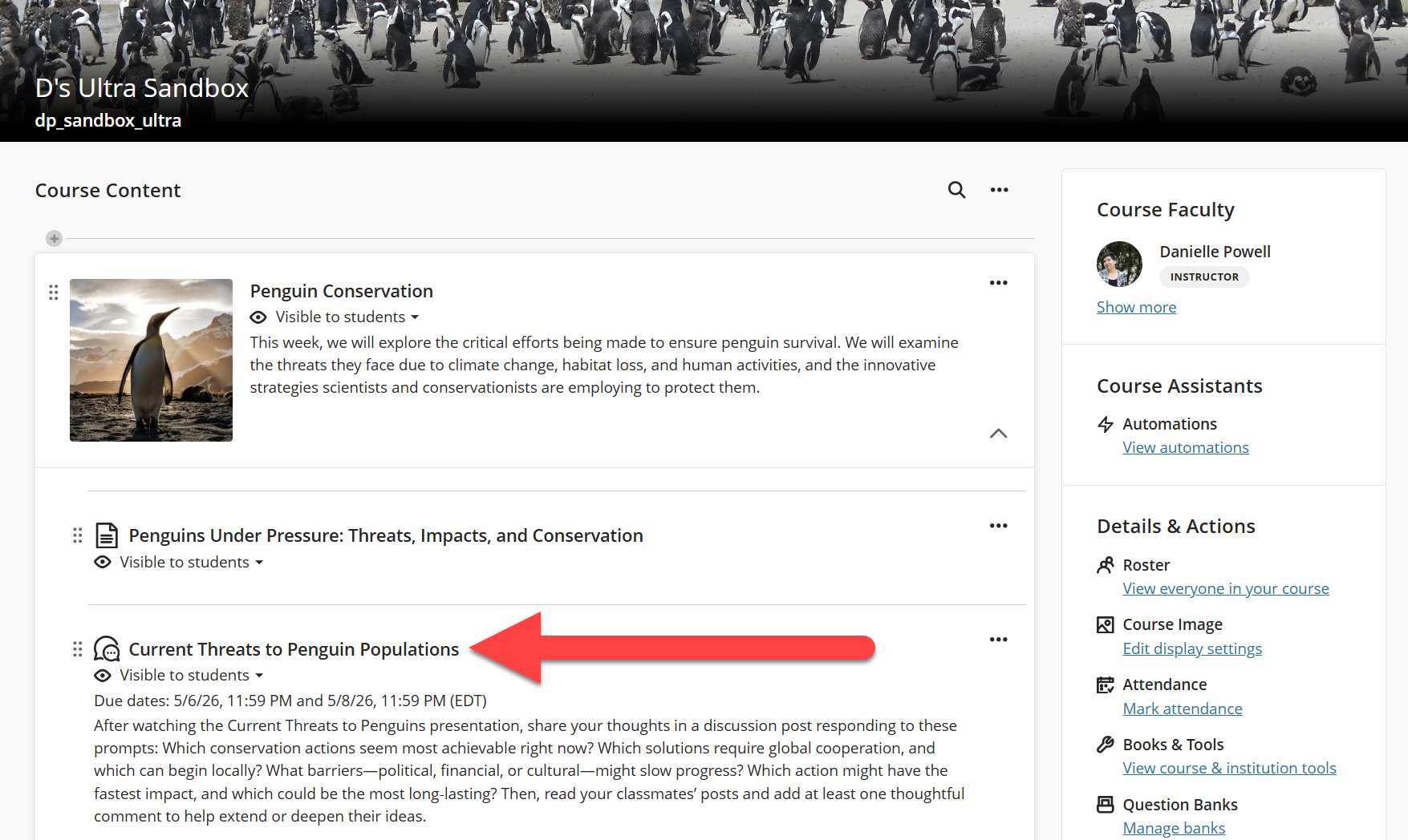 To view your students' contributions to the group discussion, locate the discussion either from the Course Content page or the Discussions page and click on the title to open.