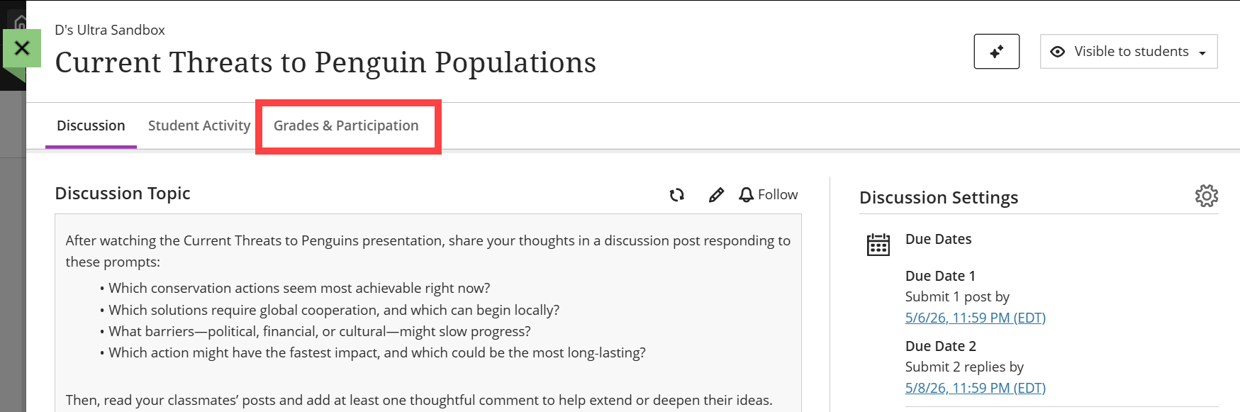 - From within your discussion: Open your discussion and click on the Grades & Participation tab.