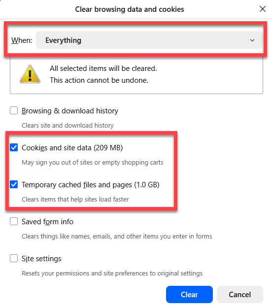 - In the When section, select a time range (we recommend Everything). Then check the boxes next to Cookies and site data and Temporary cached files and pages. Click Clear to clear your cache and cookies.