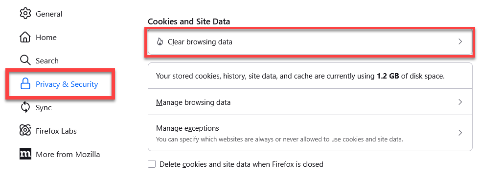 - Select the Privacy & Security panel and go to the Cookies and Site Data section. Then click Clear browsing data to open the options.