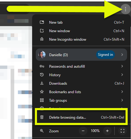 - At the top right, click the three dots menu and select Delete browsing data.