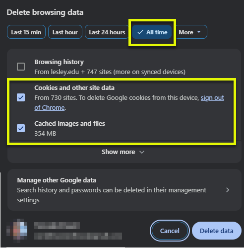 - Select a time range (we recommend All time) and check the boxes next to Cookies and other site data and Cached images and files. Click Delete data to delete your cache and cookies.