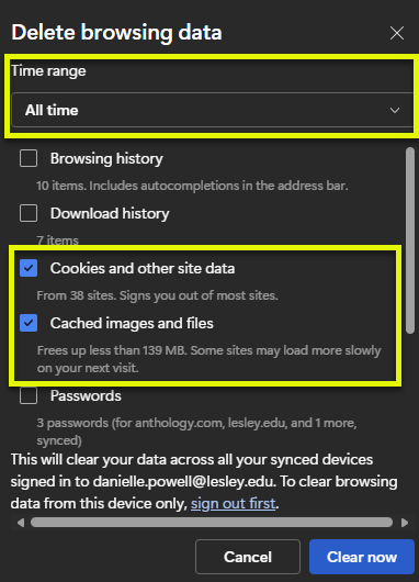 - In the Time range section, select a time range (we recommend All time). Then check the boxes next to Cookies and other site data and Cached images and files. Click Clear now to clear your cache and cookies.