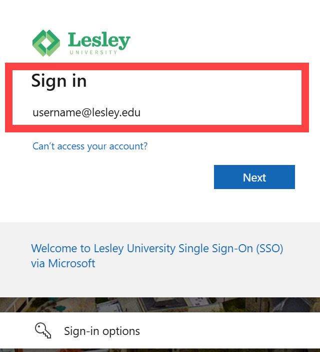 - You will be redirected to Lesley University's Single-Sign-On. Enter your Lesley credentials in the form of username@lesley.edu, then click Next to enter your password and authenticate.