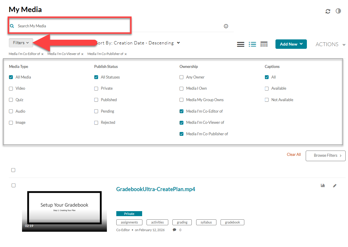 This will bring you into your Kaltura My Media. By default, your My Media will show all media that you own and media for which you are a co-viewer, co-editor, or co-publisher. You may narrow down your view by using the Search and Filter options to find media that has been shared with you.