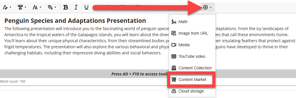 Locate the place where you want to add your media and click the Insert Content (+) button in the content editor. This will open a menu. Select Content Market.