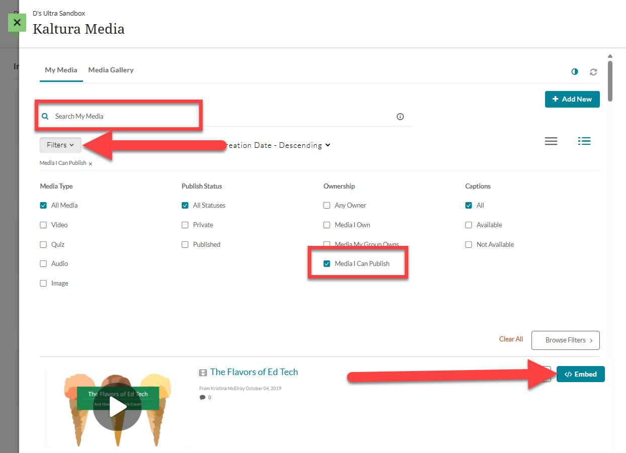 This will bring you into your Kaltura My Media. By default, your My Media will show all media that you own and media for which you are a co-viewer, co-editor, or co-publisher. You may narrow down your view by using the Search and Filter options to find media that you can publish.