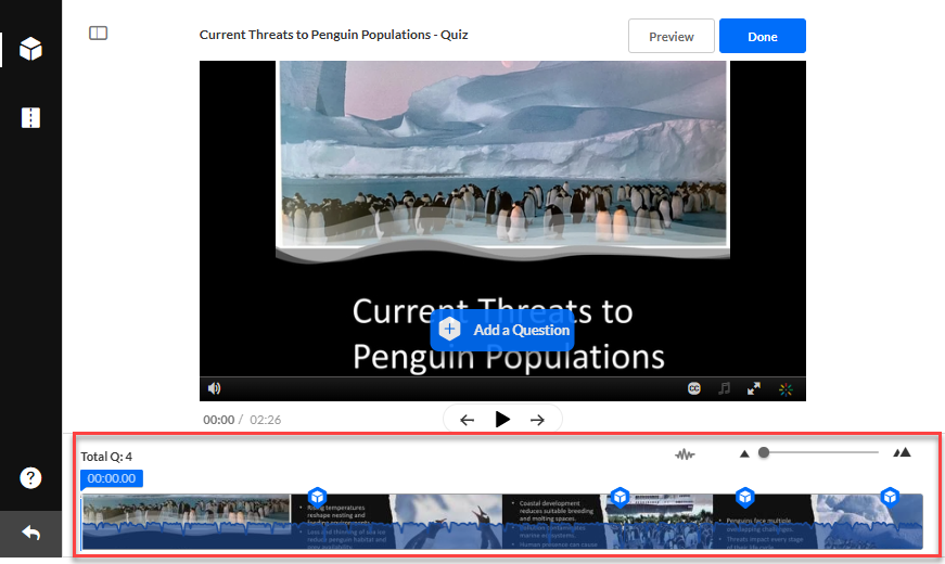 After each question is added to the quiz, a question icon appears below the video in the timeline. You can click on this icon to return to the question editor at any time during the editing process.