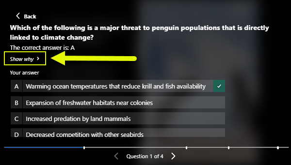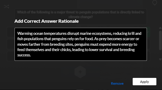 Your why will be applied to your question. After viewers complete the quiz and view their results, they will have the option to click Show why for the rationale behind the correct answer.