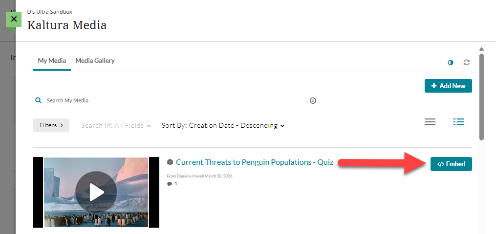 This will take you to your Kaltura My Media, where all of your Kaltura media is stored. Locate your video quiz and click Embed.