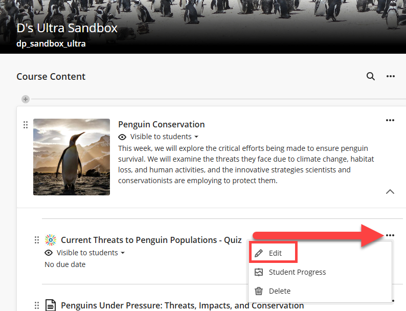 Locate your video quiz in your Course Content and click the More Options (three dots) menu. Select Edit.