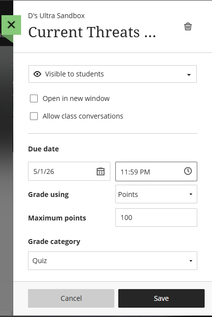 You may edit your video quiz name, change the visibility status, add a due date, maximum points, and assign it to a grade category. Click Save to save your changes.