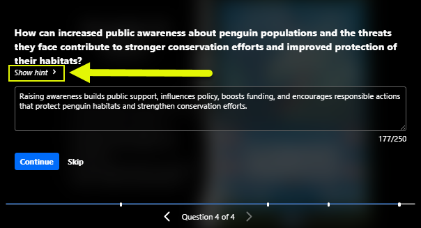 - Hint: Hints contain additional information that can help answer the question. When taking a quiz, viewers can click Show hint to show the hint. Using a hint will not affect the viewer's score.