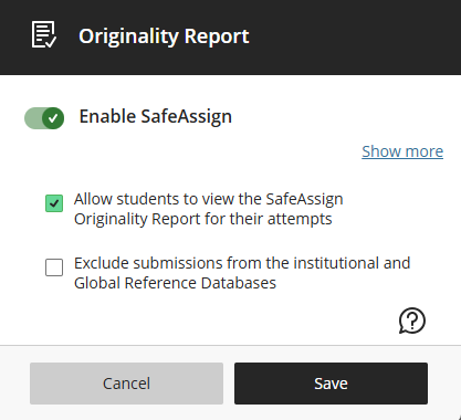 Toggle the option to enable SafeAssign and select the additional options you wish to use: