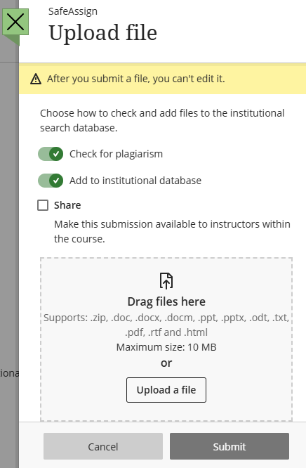 For more information and detailed instructions, refer to the Use SafeAssign in your Course support article or watch the Use SafeAssign (Original Courses) tutorial video.