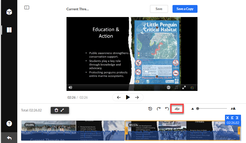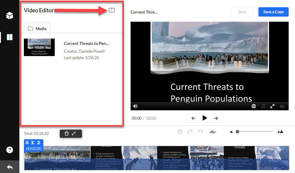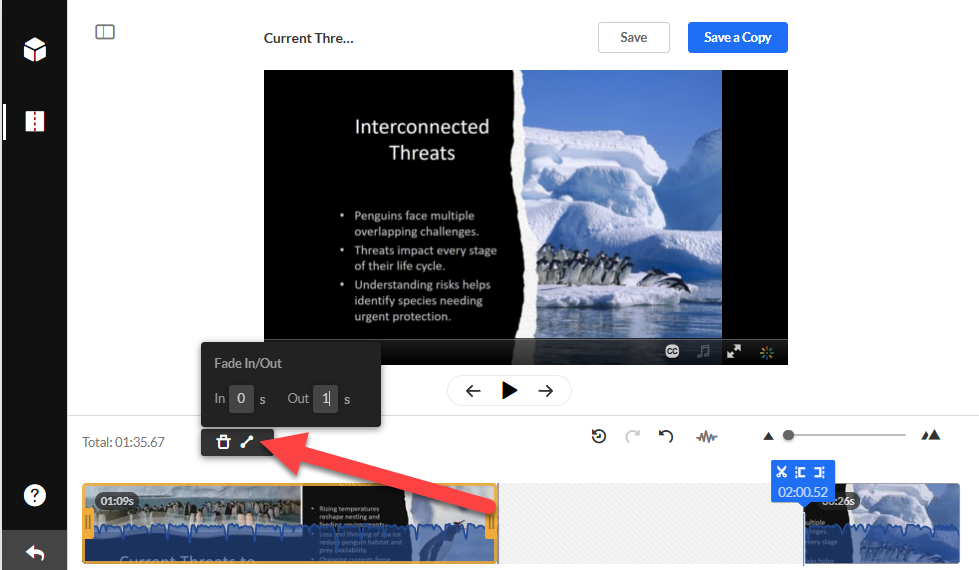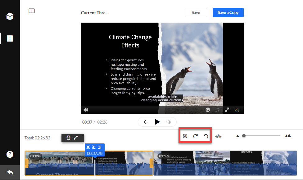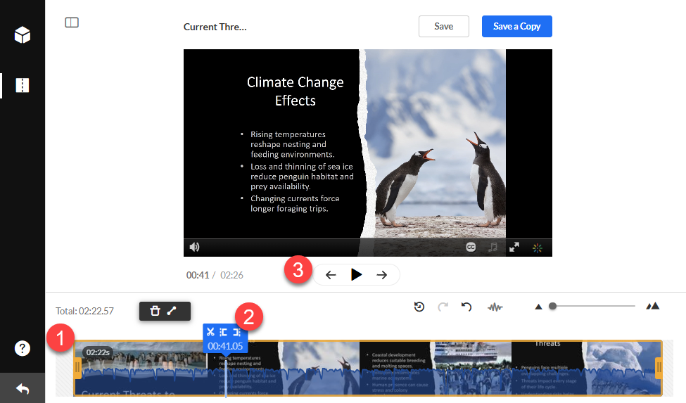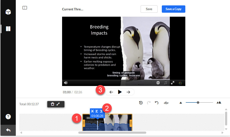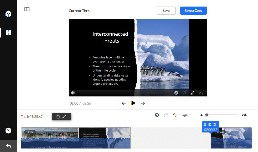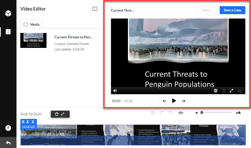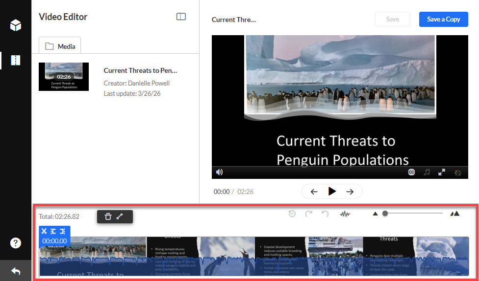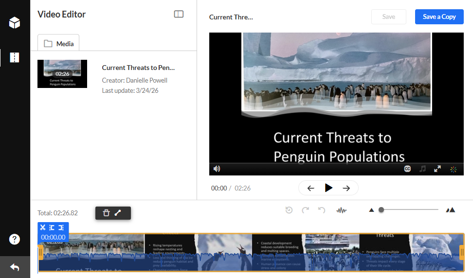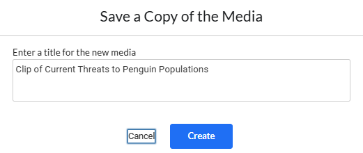 Click Save a Copy to save your clip. You will be prompted to enter a title for your new media entry, which will be saved in your Kaltura My Media.