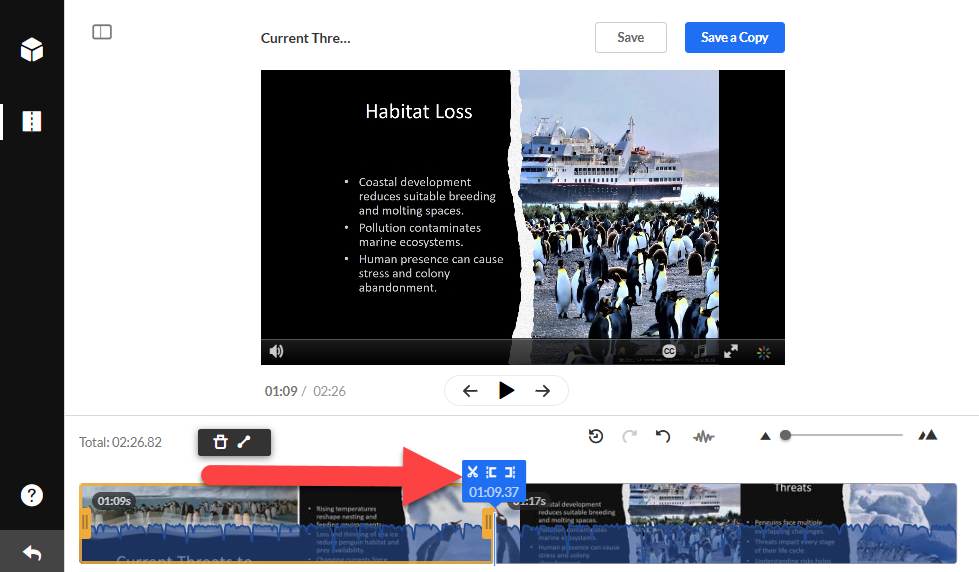 - Click on the timeline to activate the handlebars. Drag the handlebars to where you would like the video to start and stop.