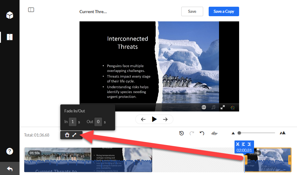 When you chop and splice your video you may want to add a fade effect to ease the transition between your sections. To do so, click on the first segment and click the Fade button above the timeline. In the Out box, enter a time between one and two seconds.