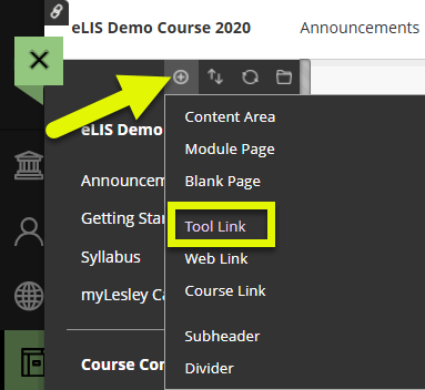 To add the Tool Link, click the Add Menu Item button at the top left corner of the course menu. This will open a menu. Select Tool Link.
