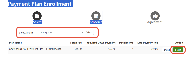 2. Select a term for your payment plan in the dropdown menu on the Payment Plan Enrollment Screen. Then press the green "Select" button to continue.