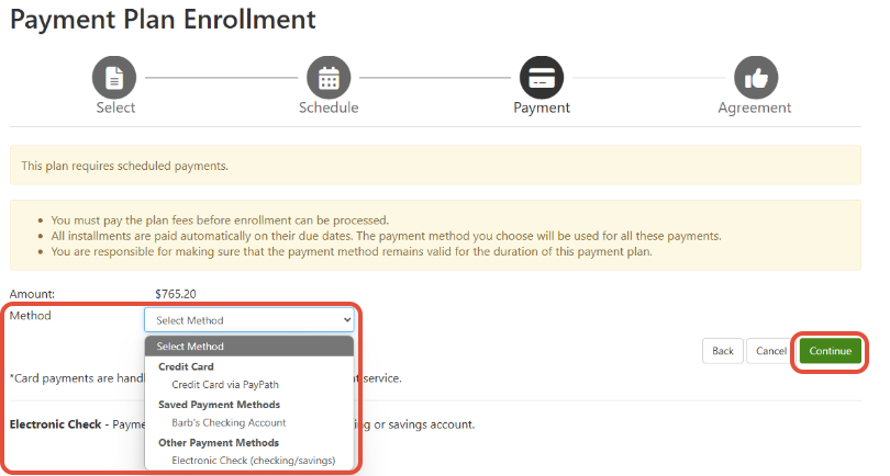 4. Select a payment method for your down payment and remaining payment plan payments from the "Method" dropdown menu. Then click the green "Continue" button.