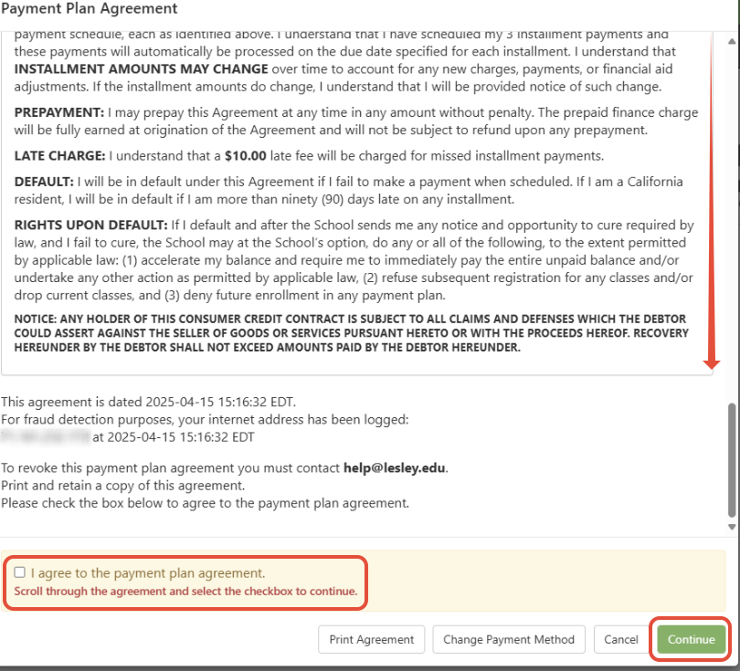 5. Review your Payment Plan Agreement. You must scroll through the entire agreement to continue. Next, click in the "I agree to the payment plan agreement" checkbox to indicate your understanding and acceptance of the payment plan agreement. Then, click on the green "Continue" button to proceed.