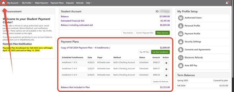 7. Once you have completed this process, select the Home icon on the top left of the screen to return to your SAC home page. You should see your Payment Plan information below your Student Account information.