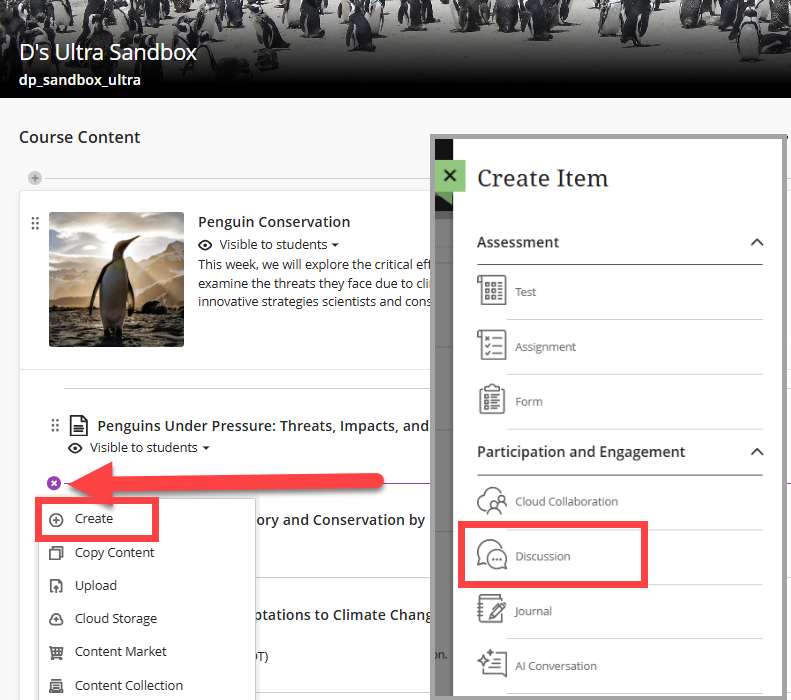 Once you create a folder, click on it to open. Then click the + button to add content within it. You may add additional folders, Ultra Documents, assignments, tests, discussions, files, links, and more.