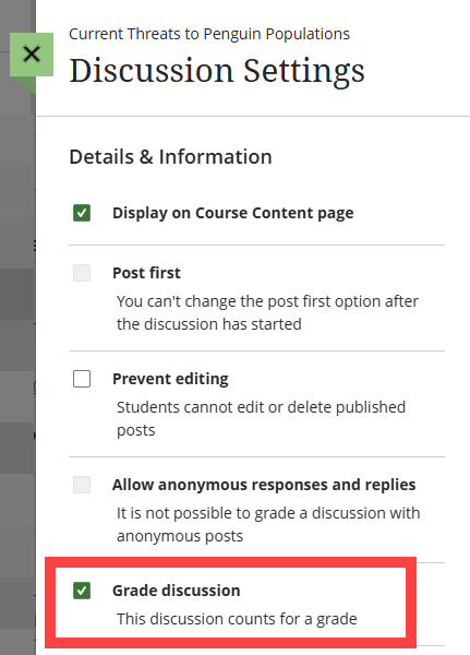 For more information, refer to the Grade Discussions support article or watch the How to Grade Discussions tutorial video.