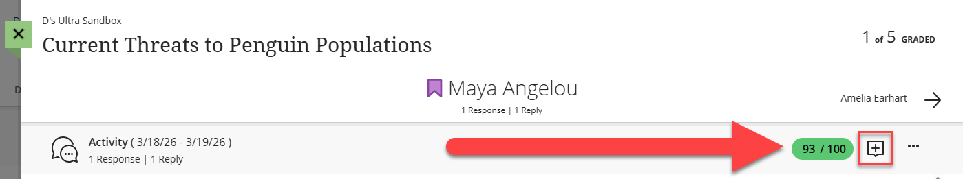 Your student's responses and replies are highlighted so that you can read their contributions in context. At the top of the page, click on the grade pill to enter a grade or to open and grade with a rubric (if using). Click the Feedback (+) icon to open the feedback panel and provide feedback to your student.