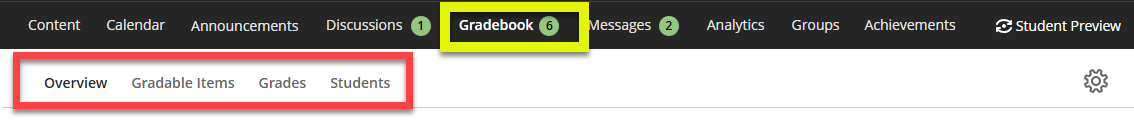 The Gradebook's intuitive navigation provides four different views: Overview, Gradable Items, Grades, and Students. Each view allows you to view and interact with the content in a different way, depending on your current needs.