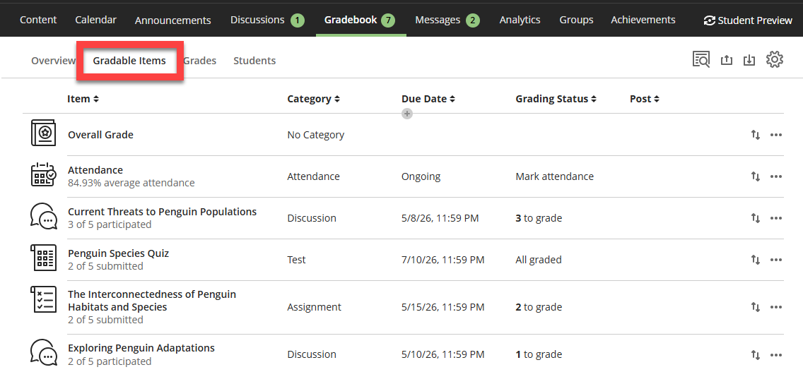 The Gradable Items view lists all the gradable items in your course. When you create a gradable item in your Course Content (ex Assignment, Test, graded Discussion, etc.) a column will be added to the Gradebook automatically. Items with missing submissions after the due date will display in red.