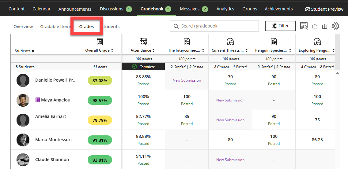 The Gradebook allows you to grade submissions, track student engagement, message students, add student accommodations, send reminders, and more.