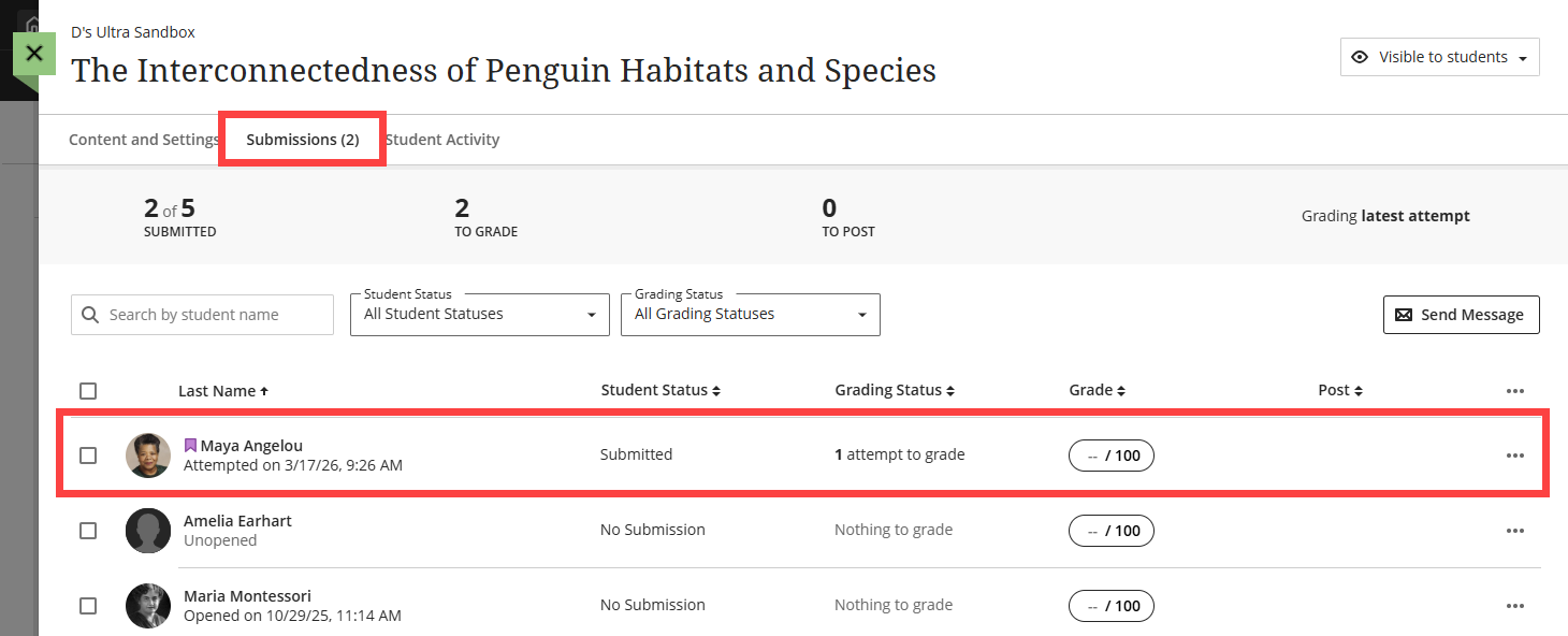 Once you have arrived on the Submissions page, select a student's name to view their assignment and begin grading.