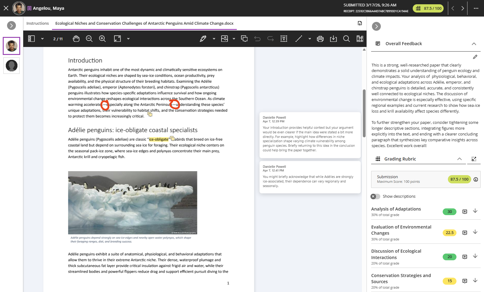 As you review your student's submission, you may use the Bb Annotate tools for inline grading, grade with a rubric, and provide feedback to your student.