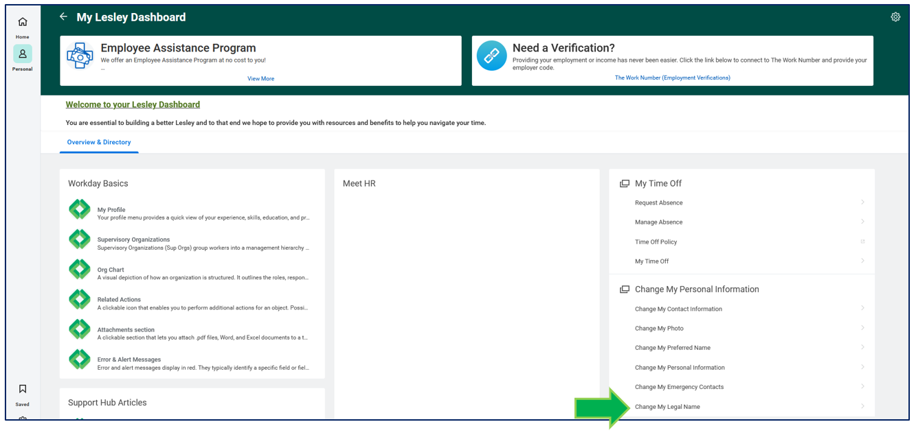 In Workday, click on the My Lesley Dashboard from the Personal category in the navigational panel on the left-hand side of your Workday homepage.