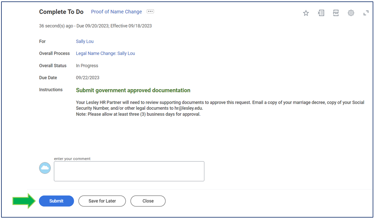 When you submit the change, you will receive a task to provide government approved documentation to verify the name change. You will email this documentation to Human Resources at HR@lesley.edu.