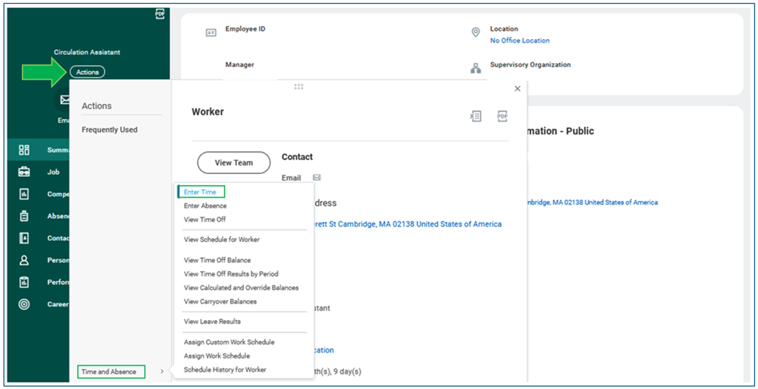 Under their Name and Title, select Actions - Time and Absence - Enter Time