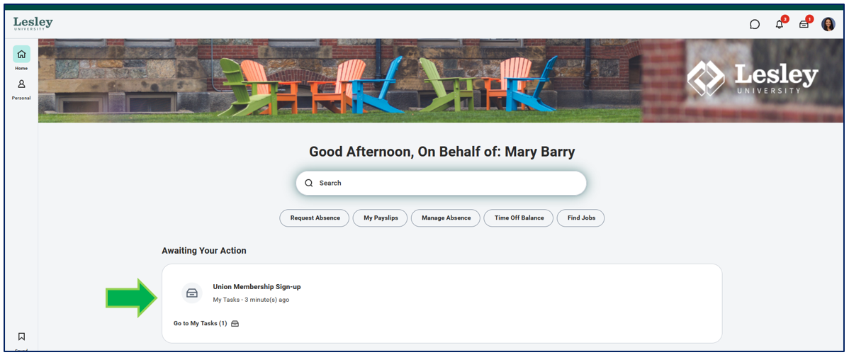 A quick way to access your My Tasks when navigating Workday is by clicking the box icon next to your profile icon.