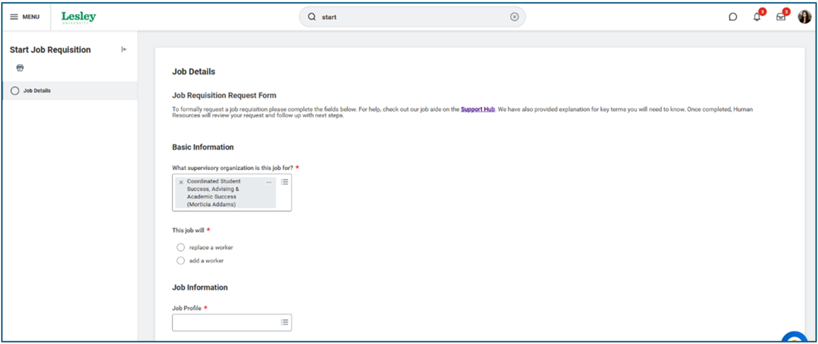 From the Workday Home page, in the search bar, type “Start Job Requisition”. Click the Task.