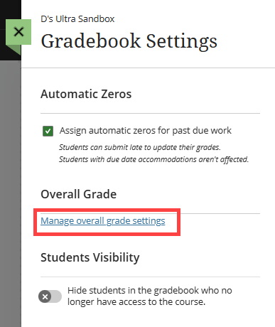 This will open the Gradebook Settings panel. Scroll down to the Overall Grade section and select Manage overall grade settings.