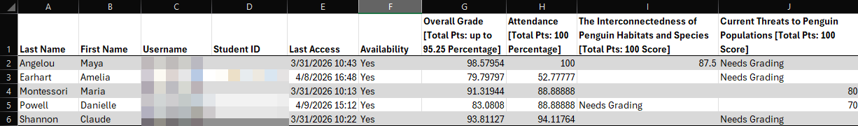 You can download your full Gradebook or selected Gradebook columns for your reference or to use in another program (ex perform a statistical analysis in Microsoft Excel). At this time, you cannot download Gradebook items that allow anonymous grading or peer review.