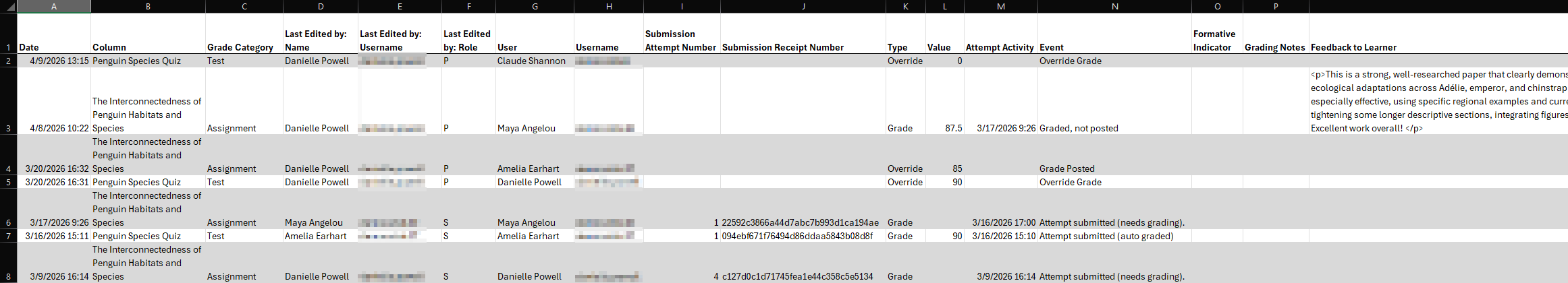 Non-posted grades are also included in the file as they provide greater insight into grade changes in the course.